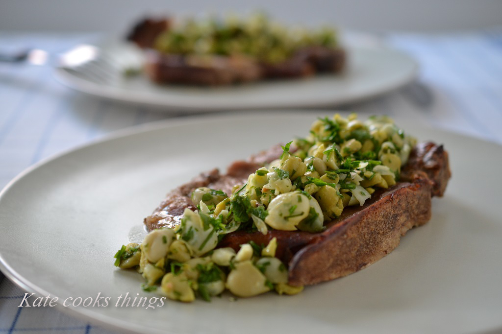 You can start preparing the broad beans about 30min before the meat is ready. Cook the beans in salted water for about 15-20min. Drain off and mash them roughly with a fork, or chop with a knife. Add chopped mint and chives, olive oil and lemon juice. Season with salt and pepper if needed. Mix it well. Serve spread over the meat.