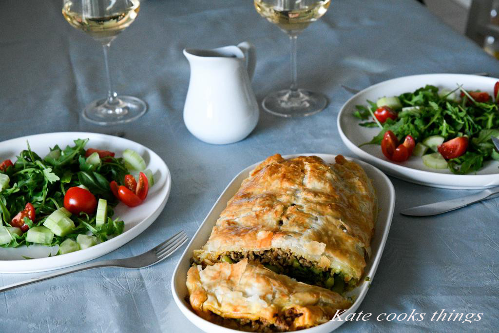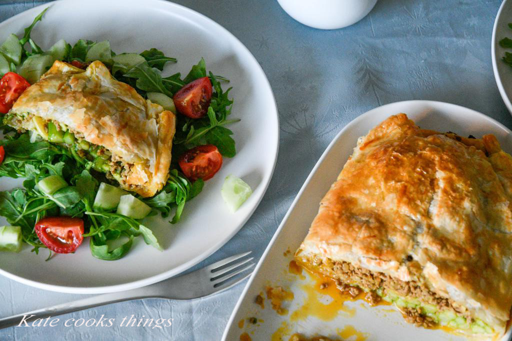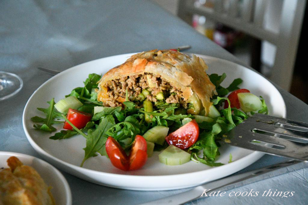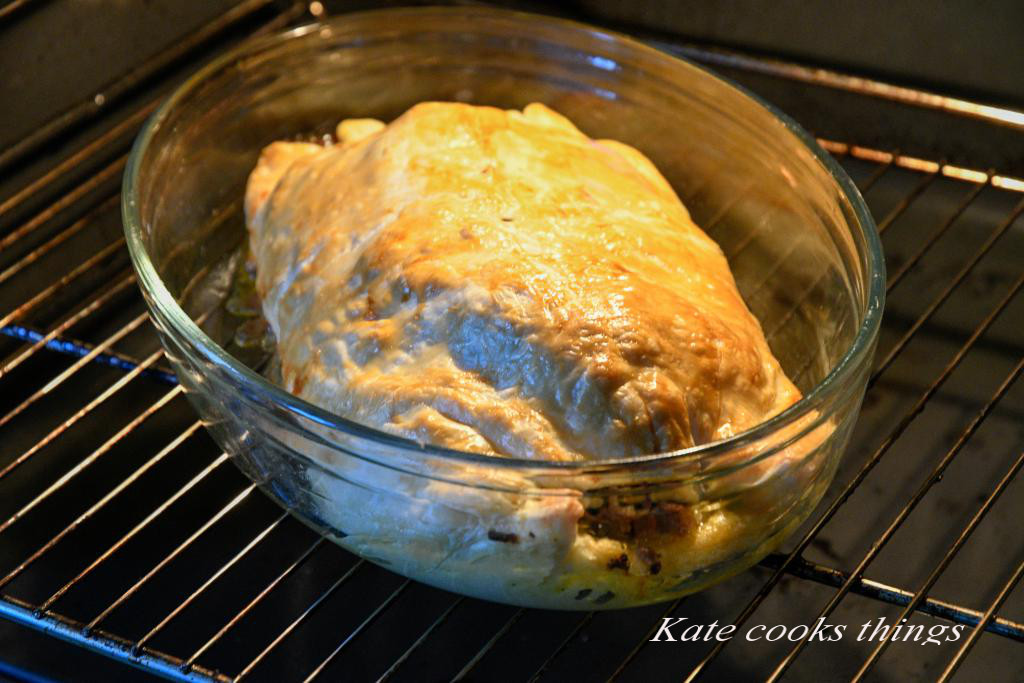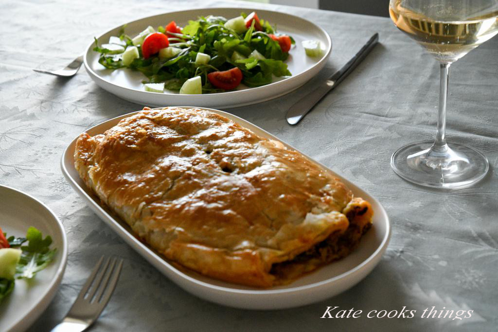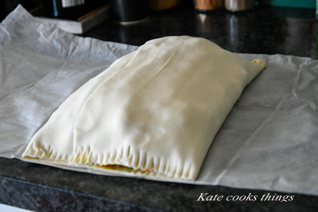 Few remarks: I would recommend rolling out the puff pastry direct into an ovenproof dish or on the baking sheet on the baking tray or form. It is much easier, trust me. Once the meat is on it, and you are closing the edges it might be very hard to move to the dish.