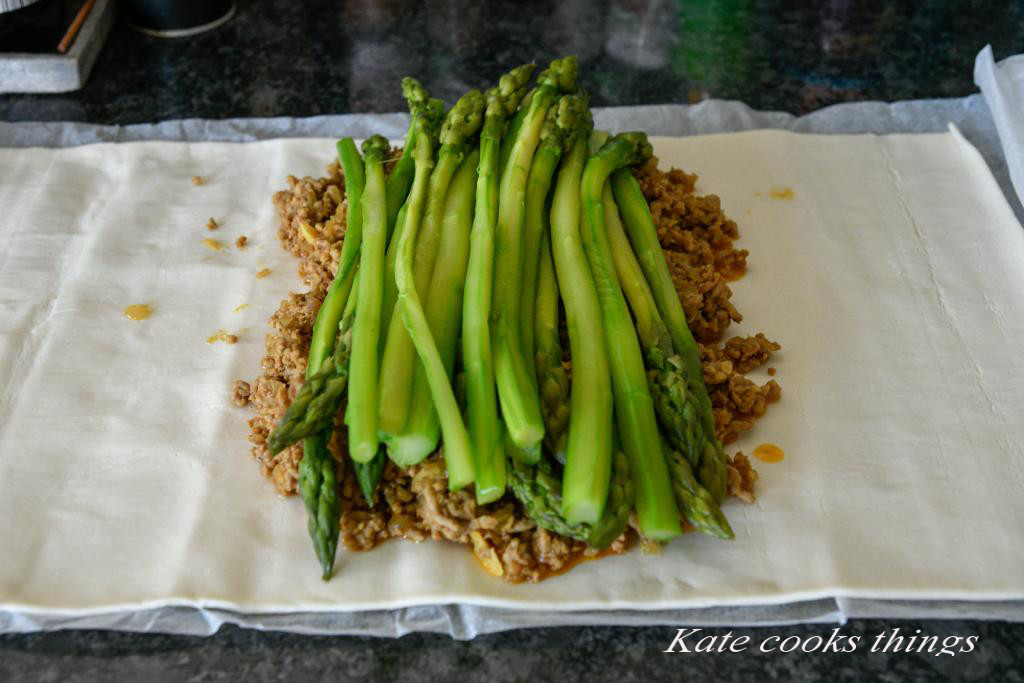 4. Prepare a baking sheet and roll out the puff pastry on it. Place the meat in the middle of the pastry. Remember to leave enough space on the sides so the edges will touch once rolled together. Place the asparagus on the meat, and gently roll the edges together. Once they connect, close the pastry on all sides. Move to an ovenproof dish, or place on the baking form. Whisk the egg in a glass and brush evenly over the pastry. Place the dish in the oven for 20 minutes.