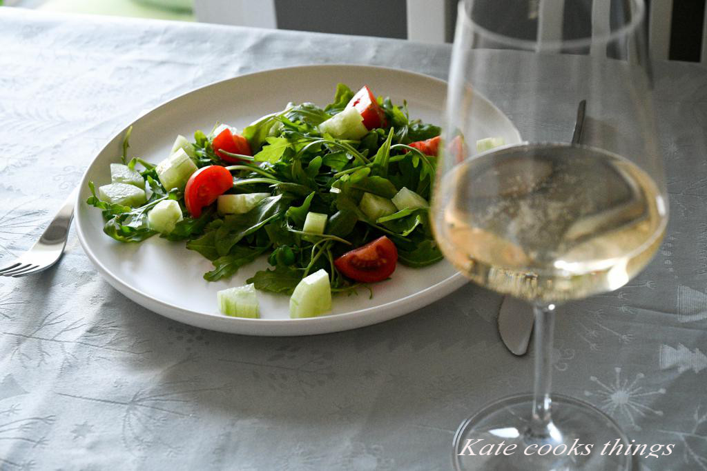 5. Prepare the salad: rinse the arugula and place on the plates. Wash the tomatoes and cucumber, quarter them and set on the plates.
